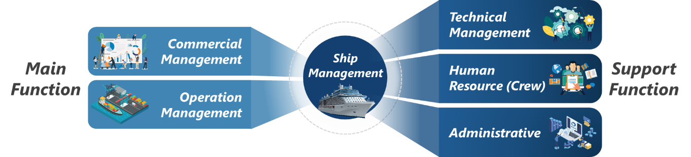 Ship management memiliki 5 elemen utama yang terdiri dari 2 fungsi utama dan 3 fungsi pendukung, penjelasan terkait elemen-elemen tersebut dijabarkan sebagai berikut: