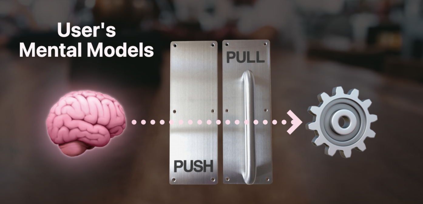 Singkatnya, Mental Model adalah bagaimana sesuatu berfungsi/bekerja menurut indvidu. Seperti cenderung kita yang menarik pintu dengan gagang seperti gambar diatas walaupun tanpa adanya tulisan/arahan. Mental model tidak selalu merupakan fakta, namun berlandaskan rasa percaya dan pengalaman individu tersebut.