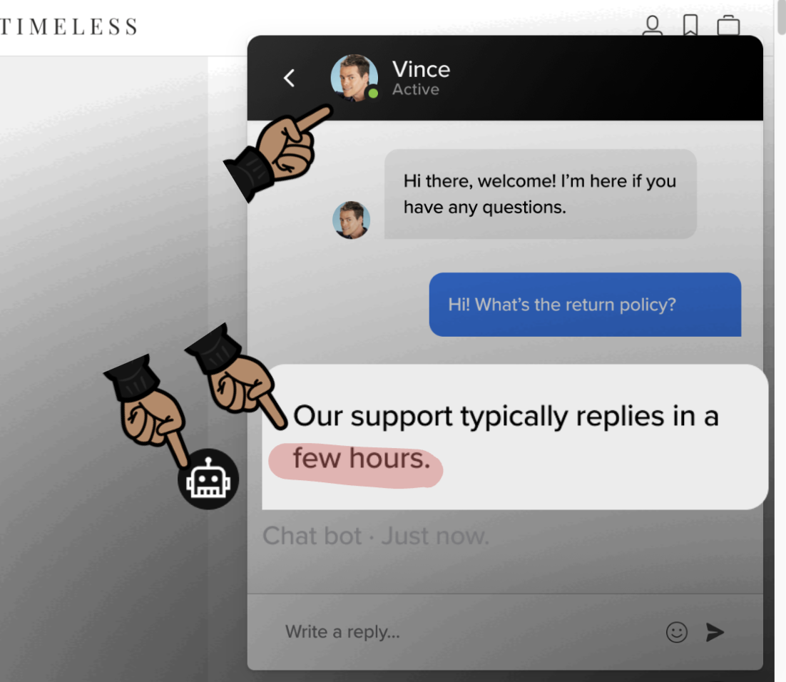 Pertanyaan Andi dibalas oleh Bot, dan harus menunggu beberapa jam untuk mengetahui jawabannya, padahal Andi berekspektasi bahwa “Yang-Menjawab-Pertanyaan” sedang dalam status aktif.