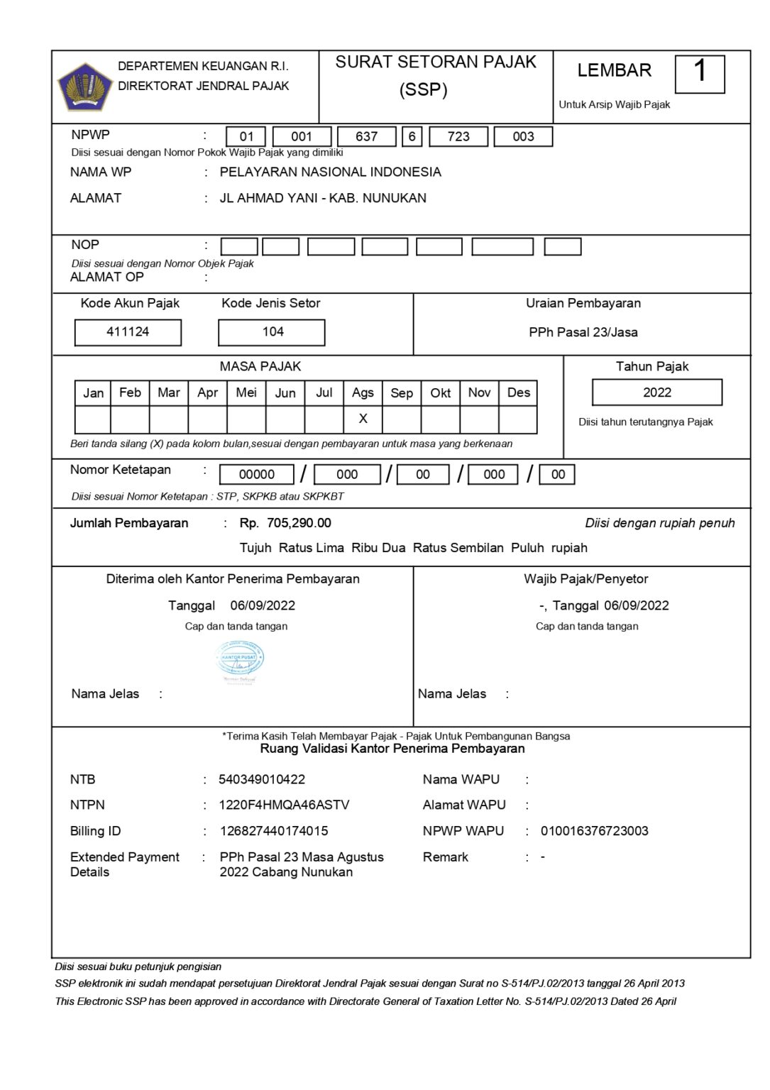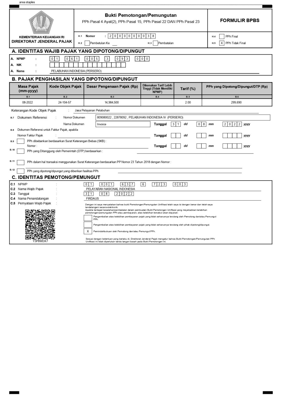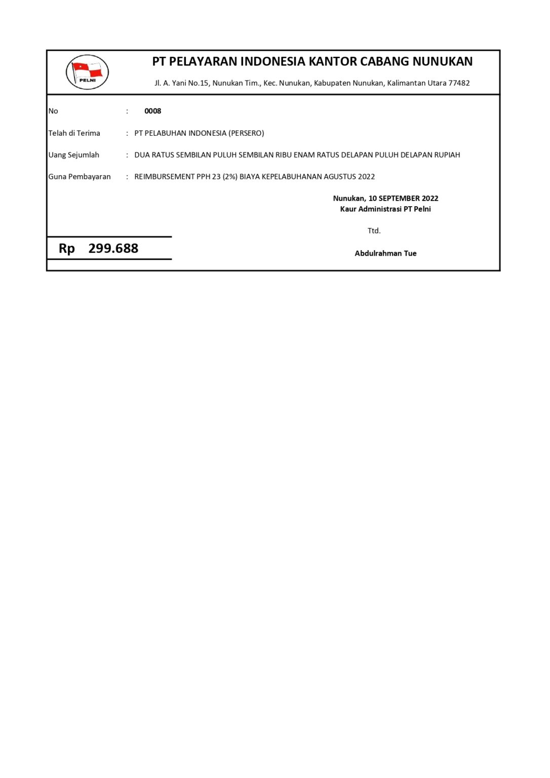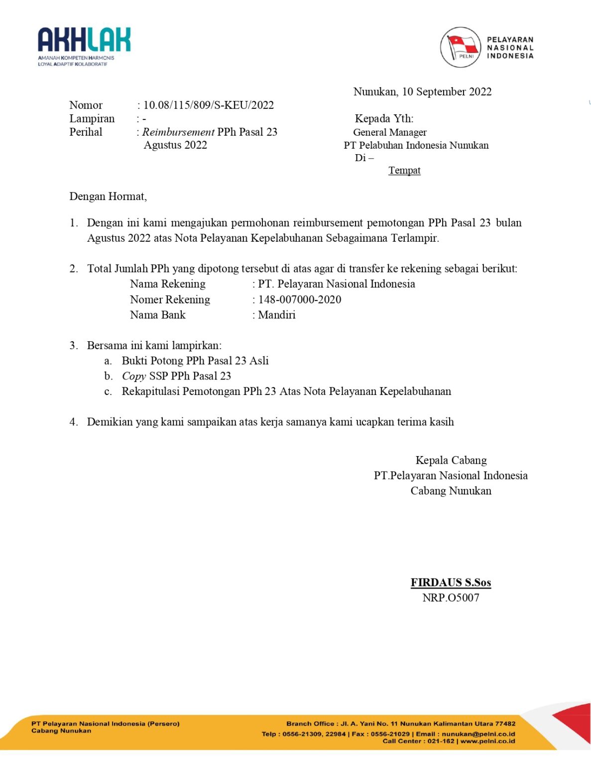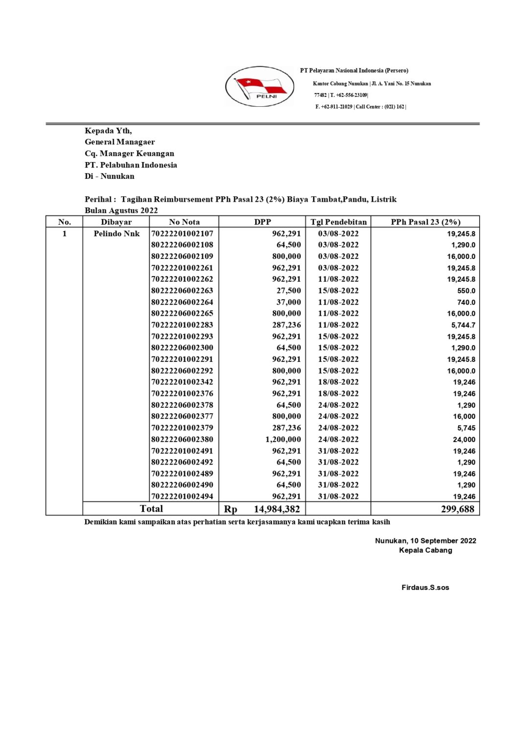 Setiap kegiatan kapal penumpang sendiri PELNI Nunukan menggunkan fasilitas dari PELINDO Pandu, Tambat dan apabila ada permintaan pengisian air tawar dari kapal maka PELNI akan menambahkan fasilitas Air Tawar seusai dengan jumlah yang diminta oleh Kapal. Yang nantinya saat muntul invoice dan akan dilakukan pembayaran mestinya di potong 2% dari jumlah bruto yang ada di invoice. PELNI sendiri memiliki faslitas PPn Dibebaskan sehingga setiap fasilitas yang di berikan PELINDO untuk PELNI akan di bebaskan nilai PPn nya sehingga hanya ada Nilai bruto nya saja, Nah nilai bruto inilah yang nantinya akan dikalikan 2% maka akan disebut Biya PPH 23 atas jasa yang akan di laporkan oleh teman teman keuangan kantor cabang dan dibayarkan oleh rekan rekan Divisi Pajak kantor Pusat.