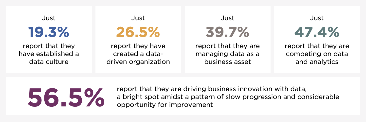 Perubahan tidak pernah datang dengan mudah untuk perusahaan mana pun, dan tingkat kesulitan diperbesar pada perusahaan yang cenderung memiliki rekam jejak kesuksesan di masa lalu, namun harus berkembang dan beradaptasi karena kondisi bisnis dan ekspektasi konsumen yang sudah bergeser. Studi ini sekali lagi mencerminkan bahwa tantangan budaya menjadi hambatan terbesar sebuah perusahaan untuk menjadi  data driven organization dalam survei yang dilakukan dalam waktu 4 tahun berturut-turut.