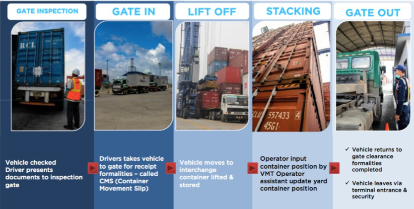- Gate In: Pengemudi menyelesaikan formalitas dokumen, seperti penerimaan CMS (Container Movement Slip).