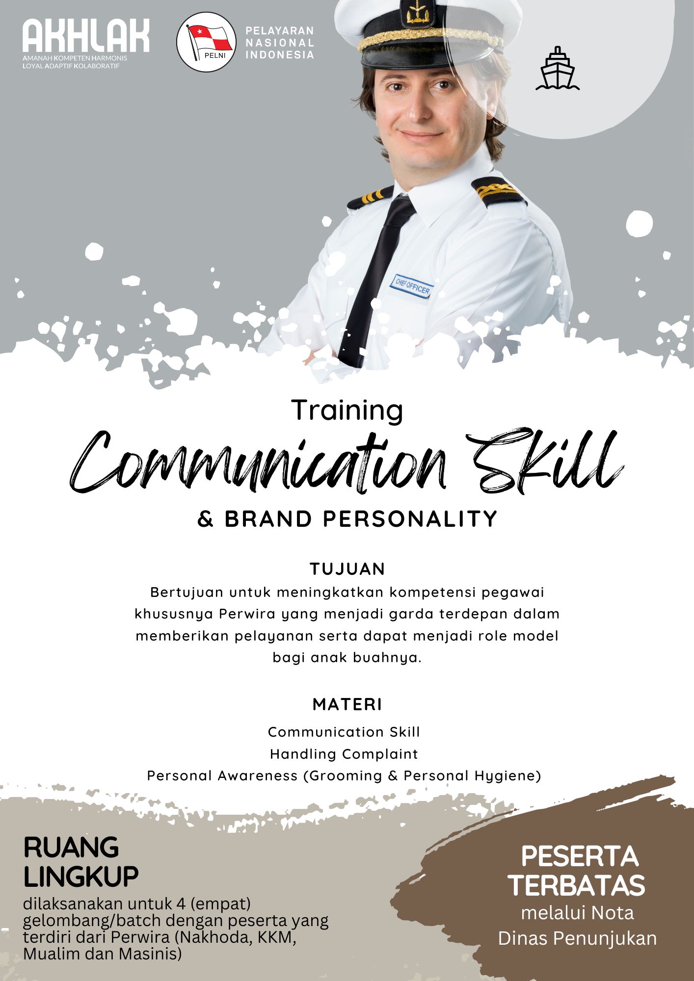 Ruang Lingkup Pelaksanaan Sasaran peserta pelatihan yaitu Nakhoda, KKM, Perwira Deck dan Perwira Mesin (Peserta Terbatas Melalui Penunjukan Nota Dinas). Program dilaksanakan selama 3 (tiga) hari secara Tatap muka/Offline pada : Hari Selasa s/d Kamis Tanggal 31 Januari  s/d 2 Februari 2023