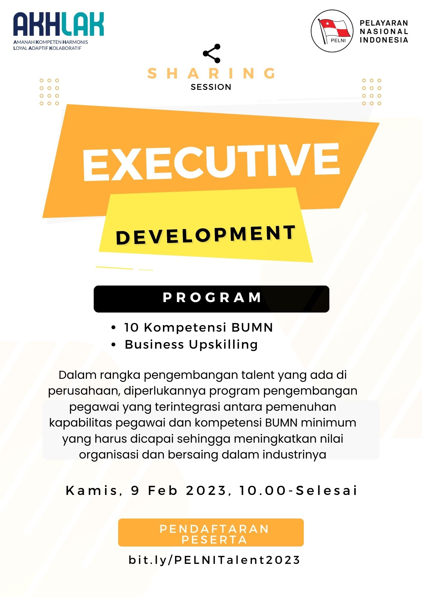 Dalam rangka pengembangan talent yang ada di perusahaan, maka akan dilaksanakan program sharing session yang akan diselenggarakan pada : Hari/Tanggal : Kamis, 9 Februari 2022, Waktu : 10.00 - selesai Metode dan tempat pelaksanaan : akan diinformasikan selanjutnya Peserta pelatihan dibuka untuk seluruh pegawai di lingkungan PT PELNI (Persero) dengan mendaftarkan diri melalui link berikut : bit.ly/PELNITalent2023
